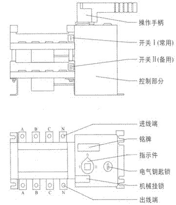 2、全自动调试:按接线图接好相应的线,确认无误后再开启电气锁,然后接通双路电源,开关应转到“I”挡;再断开常用电源,开关应转到“II”挡:然后再接通常用电源,开关应返回转到“I”挡。