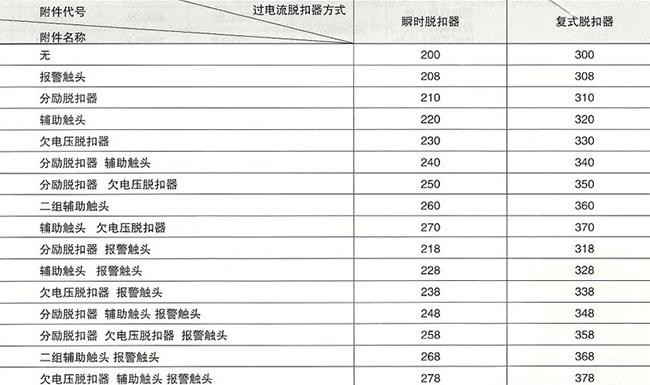 注:1.表中所列规格用户根据需要选取,但在一台断路器中不应超过表中每格中所规定的项目。
