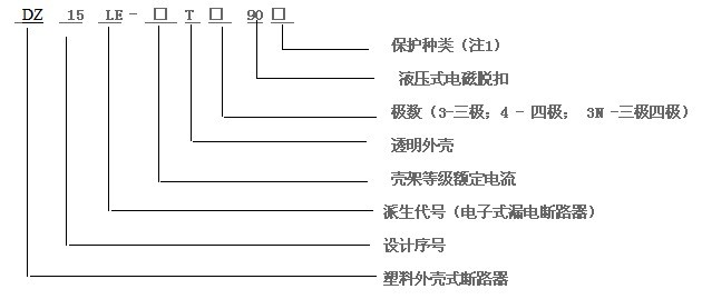 例如:订购DZ15LE-100T/3901漏电断路器,过电流扣器额定电流100A,额定剩余动作电流30mA,分断时间<0.2s,三极,配电保护用,数量10台。